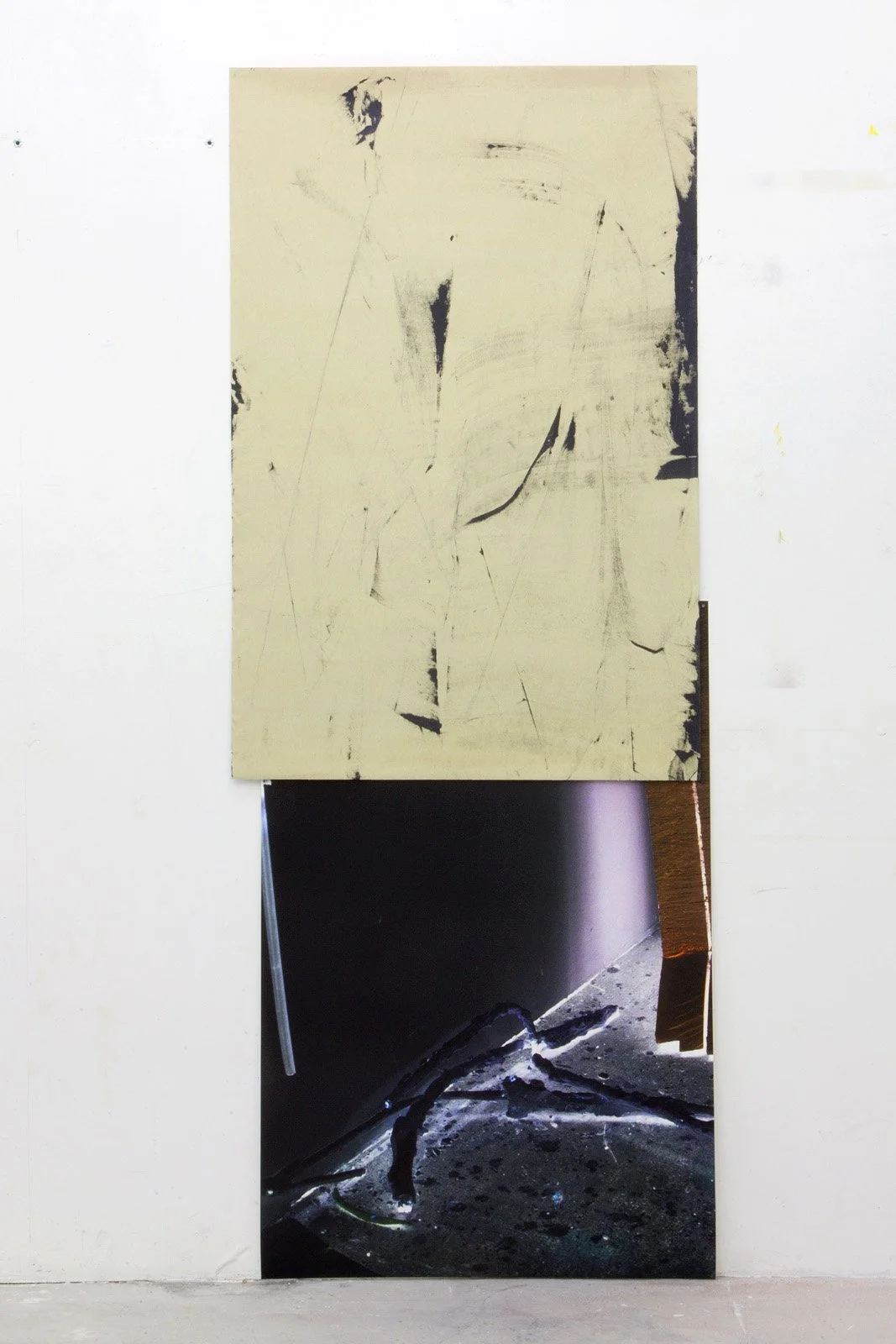 Sans titre, 2018, acrylique sur toile, photographie, impression jet d’encre, 207 x 83 cm, vue de l’exposition personnelle Sommeil d’airain, Fondation Takini, Lyon